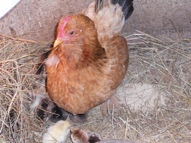 Son came in the house carrying her under one arm and a bucket in the other.  The bucket full of little chicken "nuggets".  Fourteen of them in all.  Here's hoping that they're a hardy bunch.  The weather is only getting colder.  Mama has her job cut out for her.  She has a heat lamp to  help.